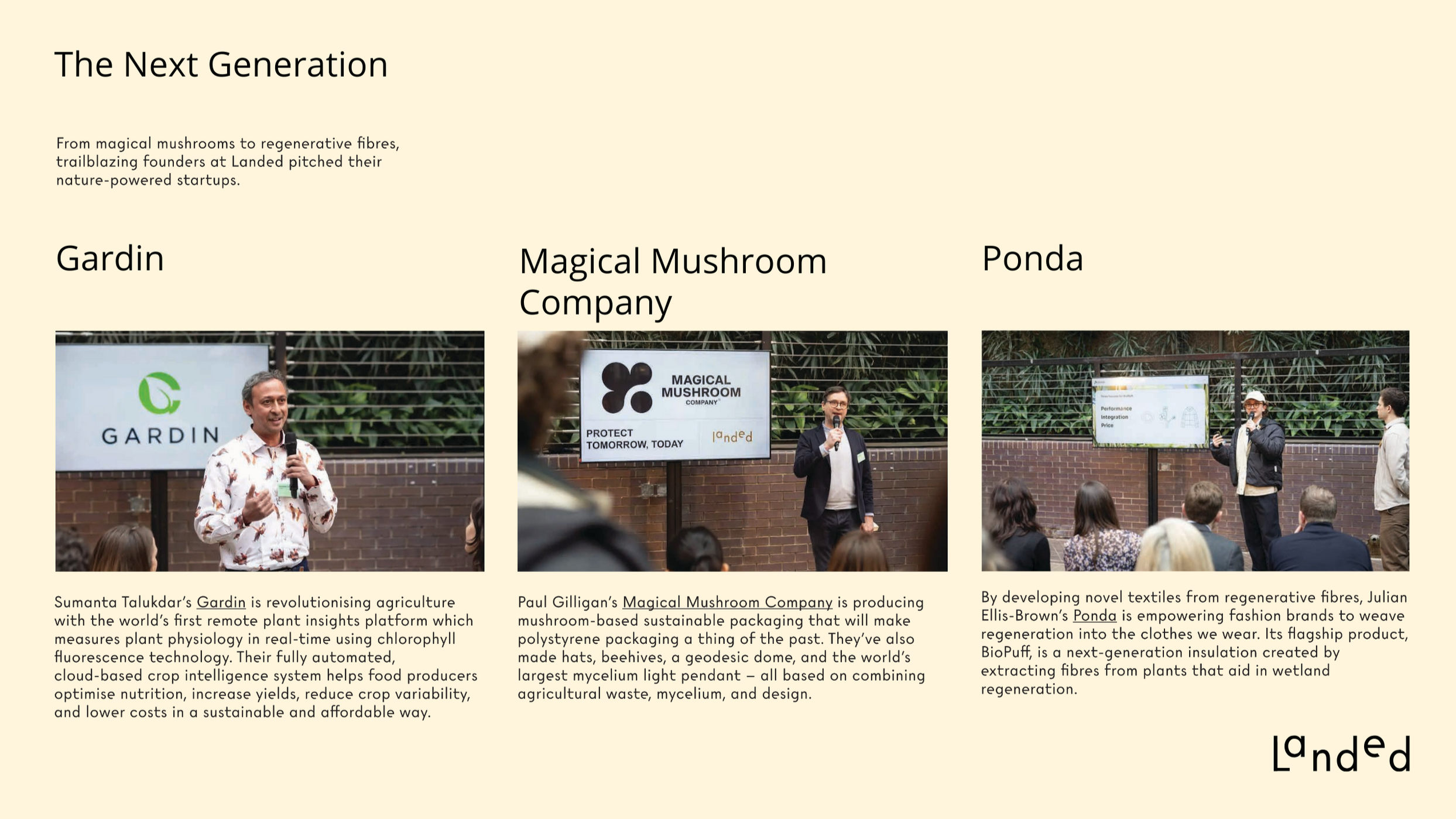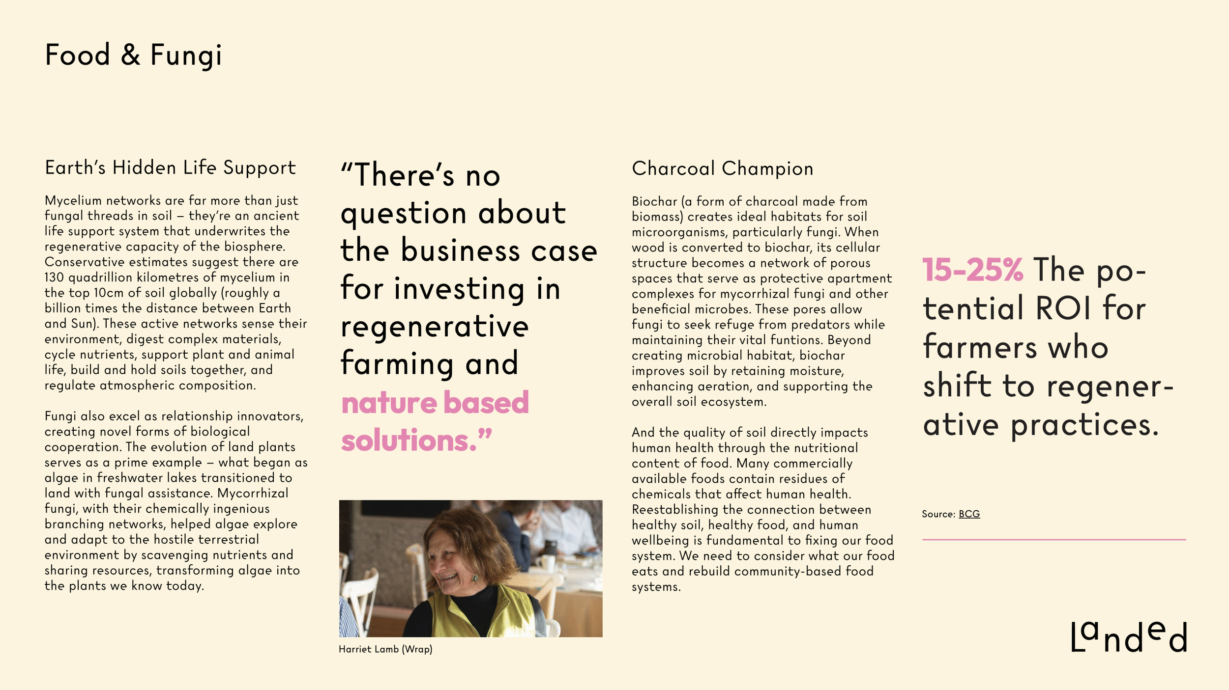 The case study highlights four core themes that shaped the event’s narrative: Earth at a Crossroads, Nature Capital, Food & Fungi, and Fashion. Through impactful storytelling, I showcased the visionary founders, scientists and campaigners who shared practical strategies for driving both planet-positive impact and long-term value. The design calls on leaders to rethink the human-nature relationship and positions Landed as a powerful platform for regenerative thinking and collaboration.