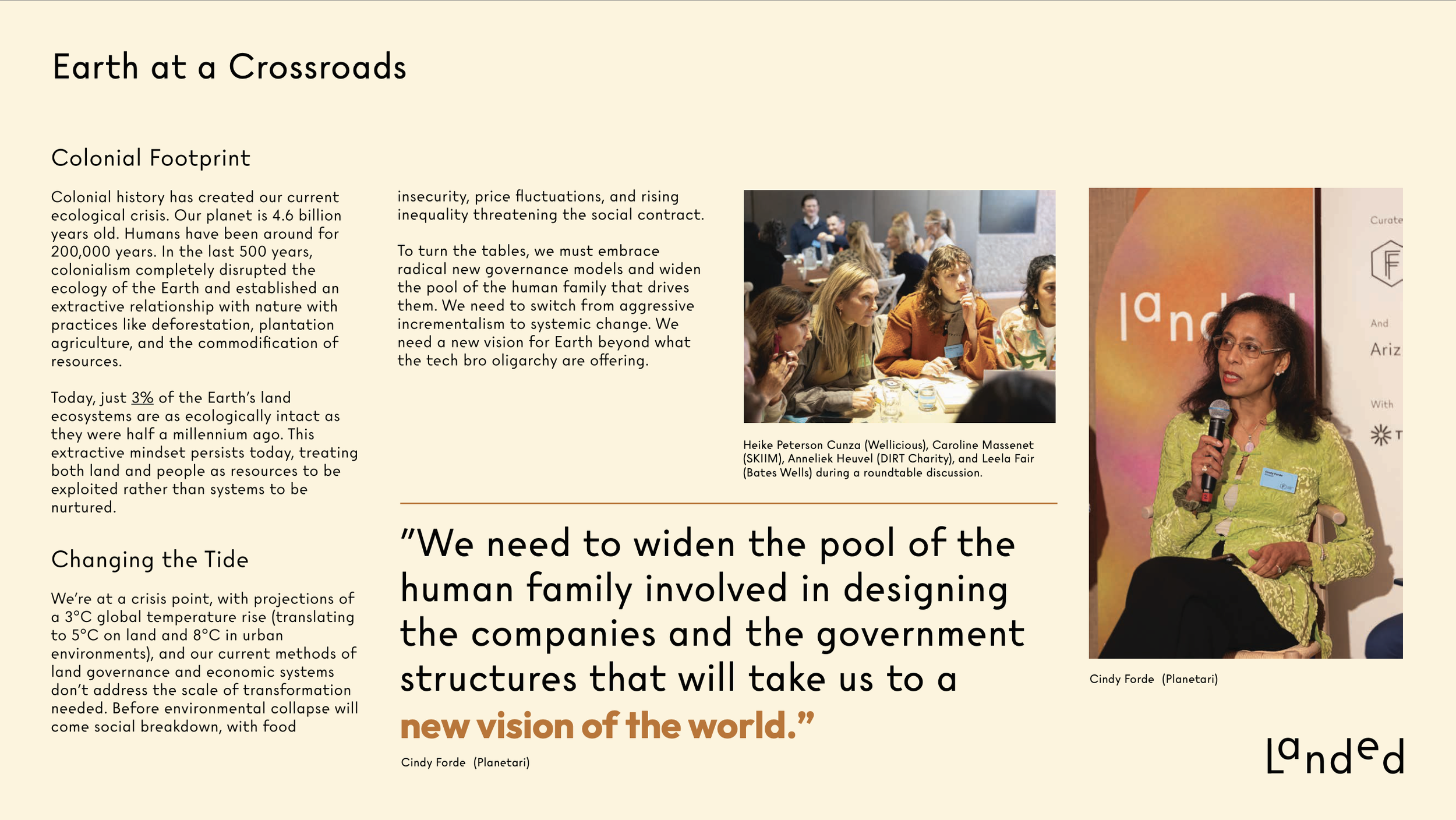 I developed a digital case study for Landed, the first Founders Forum Group event fully dedicated to nature, co-curated with Tech Nation and environmental advocate Arizona Muse. Designed to inspire action at the intersection of tech and nature, the case study introduces the urgent reality of Earth’s ecological crisis and explores how regenerative practices can replace centuries of extractive behaviour. With a clear visual hierarchy and editorial tone of voice, the experience immerses viewers in the key question underpinning the event — what is the business case for nature? — and sets the stage for a day of insight and innovation.